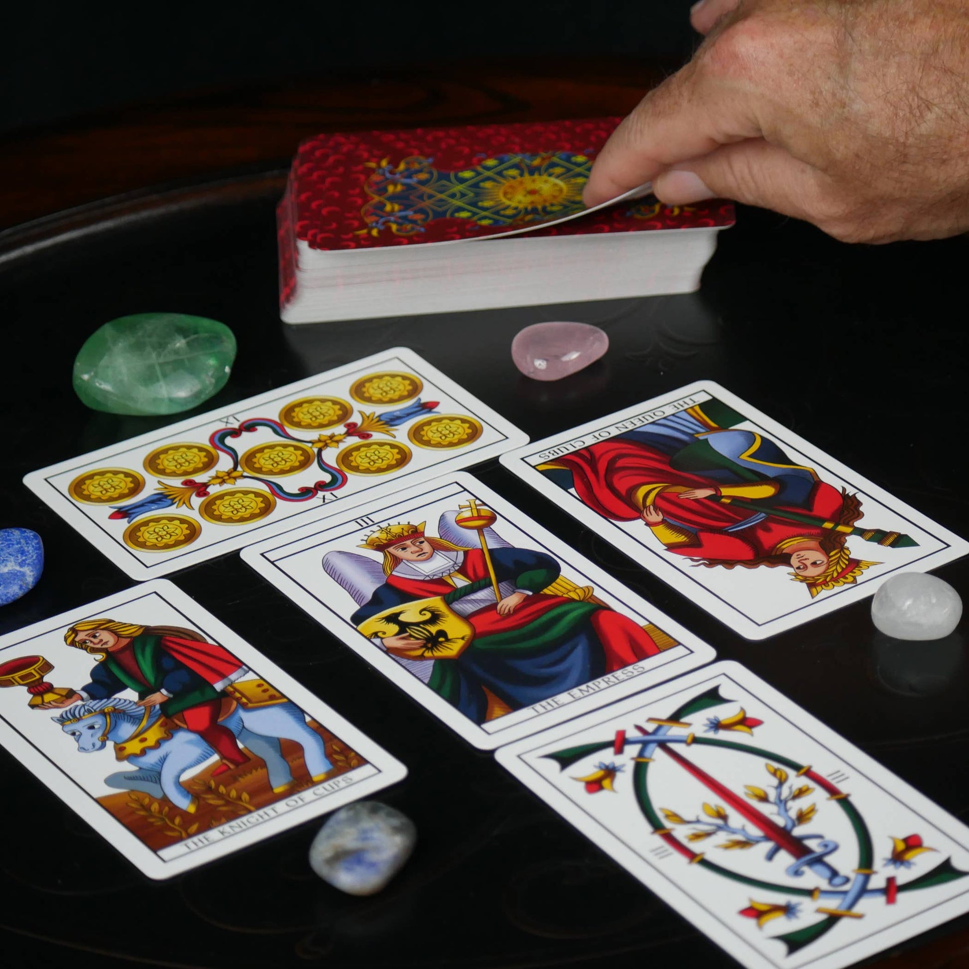 Historical “Tarot de Marseilles” deck remastered. Features sharper lines and vivid colors. Note, the included guide book is RWS-style. The cards have been enhanced them to provide you with crisper, high-definition images. Colours and graphics have been amplified to provide you with a modern take on this classical deck. The quality of the card stock will hold up in professional, repeated use and the size of the cards will make them easy to shuffle.